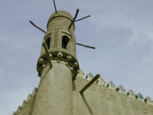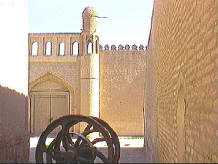 The Khan's palace is a large building, ornamented with pillars and domes, which, covered with bright coloured tiles, flash in the sun, and attract the attention of the stranger approaching Khiva. A guard of thirty or forty men armed with scimitars stood at the palace gates. We next passed into a small courtyard. the Khan's guards were all attired in long flowing robes of various patterns, bright coloured sashes being girt around their waists, and tall fur hats surmounting their bronze countenances. The courtyard was surrounded by a low pile of buildings, which are the offices of the palace, and was filled with attendants and menials of the court. Good looking boys of effeminate appearance, with long hair streaming down their shoulders, and dressed a little like women, lounged about, and seemed to have nothing in particular to do.