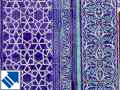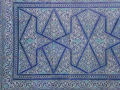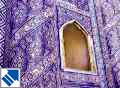 The deep blue, white and turquoise (which means 'colour of the Turks') floral motifs of Khiva's majolica tiling originate from the island of Majorca. Their cooling colours became popular in the desert heat of North Africa and rapidly spread right across the Muslim world. In the mid-eighteenth century the invading Persians introduced the style to Khiva and, although the colours had been used before, the intricate flowing patterns pleased the Khan and the tiles remained long after the raiders had been repelled. |