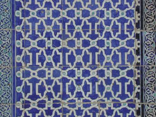 The deep blue colour was obtained by firing the tile at exactly the right temperature with a glaze made from a desert plant. The procedure was a closely guarded secret and by the 1960's there was only one aging ceramist who remembered the traditional method. Thrilled that the Soviets had decided to begin restoration of the Ichan Kala, he offered to divulge the mystery of the deep blue colouring to the Russian archaeologists. Unfortunately they showed no interest in his old-fashioned ways, preferring instead to use modern, chemical pigments. The secret was lost and the walls of the Tosh Hauli have been scarred with the result. Tiles added in restoration are easy to distinguish as they fail to achieve the deep blue of the originals and look as though they have been applied with a marker pen. |