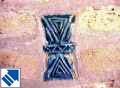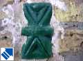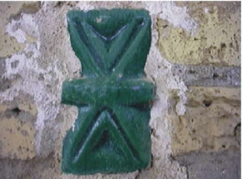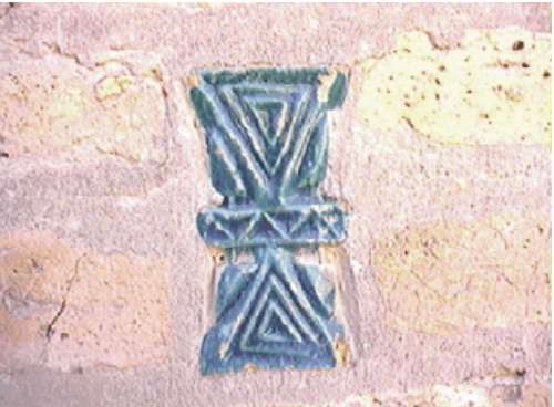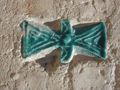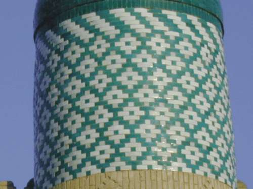 Many of the buildings in Khiva are dotted with deep green butterfly-shaped tiles. This design originates from Zoroastrian times and symbolises a whole and balanced life. The two inward-pointing triangles represent good thoughts and good words while the narrow strip in the middle represents good works. The older tiles bear triangular markings whilst the newer ones are generally blank. |