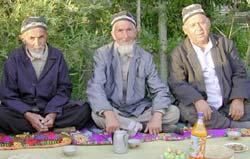 A woman's 63rd birthday is called a 'laychak' (scarf) celebration because this is the day she receives a large white scarf. After the eating and drinking begin to cease, the Halpa, (a sort of female Mullah) chants a blessing from the Koran and prays in the presence of the women guests. Then a close female relative places an Uzbek 'dopa' (traditional square hat) on the hostess' head over which she wraps the 'laychak’' scarf like a turban before arranging another scarf on top. All the female guests slowly rise and present their own gifts of brightly coloured scarves or money while kissing the woman on both cheeks. As a thank- you, the woman gives a deep 'salam' (bow) first to God and then to her husband and the other guests. The whole procedure finishes with another prayer followed by the usual dancing and merriment.