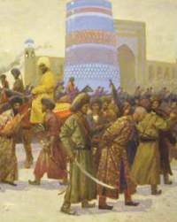The decision as to who should be the next Khan was made by the war-weary Khivan troops during their return to Khiva with the headless corpse of Mohammed Amin. On arrival they pronounced Abdullah Khan as the new ruler of the Khanate. This was immediately contested and almost resulted in an attempt to behead Abdullah Khan by one particularly affronted claimant. The Yomut Turkomans also had princes with a claim on the throne, and despite their speedy assassination by strangulation, the Yomuts refused to recognise Abdullah as Khan. The Khan rode out to meet them with his troops, but were met by the pacifying Yomut Okhstakles (white beards) who came to meet him bare-footed and with their swords suspended from their necks as a sign of submission. This submission was to prove short-lived and within two months the Yomuts were once more rebelling and again the Khan went to meet them with his troops. During the ensuing battle the Khan was slain and, in all the confusion, was thrown into a mass grave with the other dead. The retreating Khivans once more found themselves without a Khan, and this time chose Abdullah's brother, Kutluq Murad Inaq. | |
